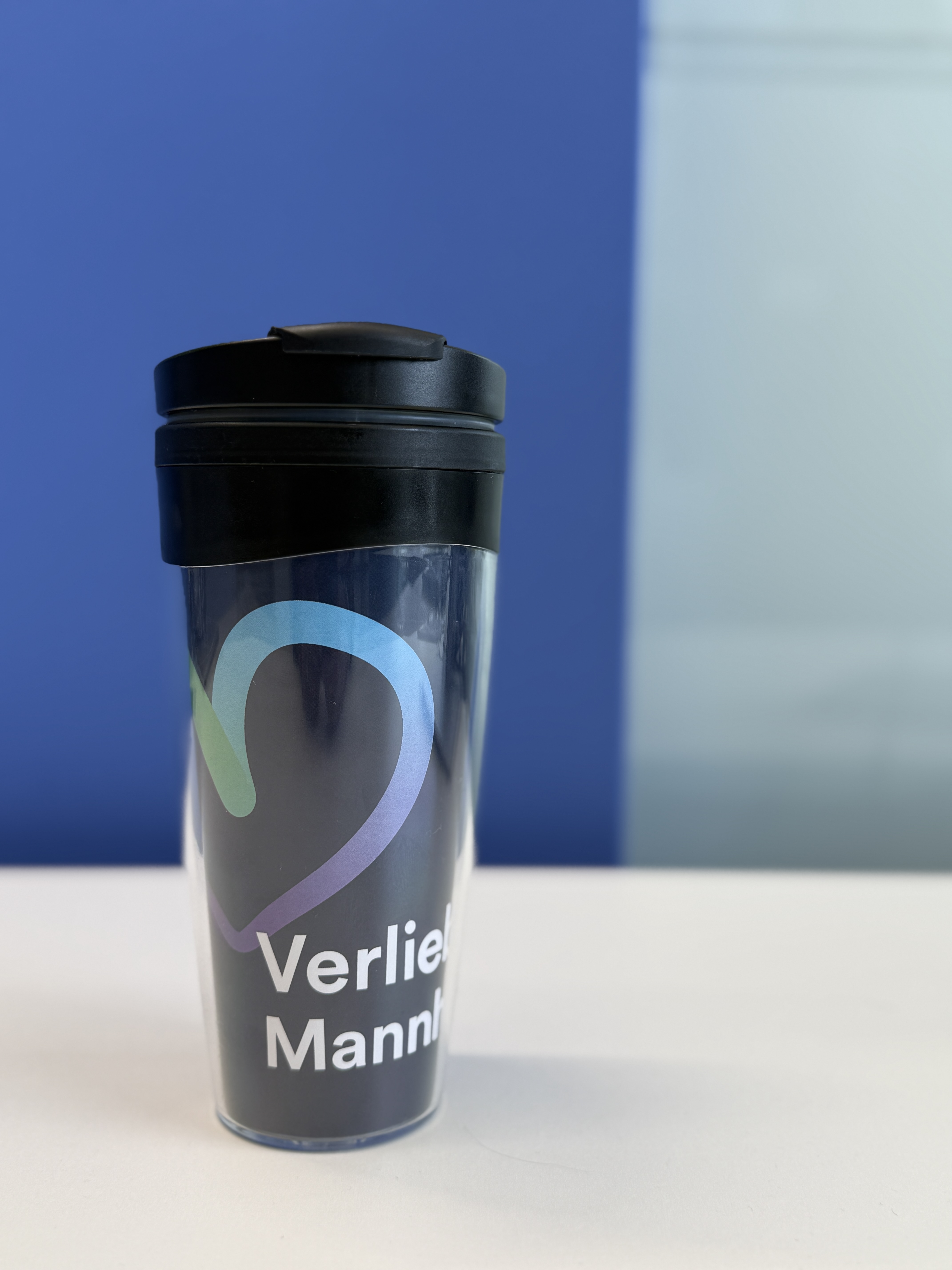 Kunststoff mit verschraubbarem Deckel und leicht hoch gezogenem Trinkrand.